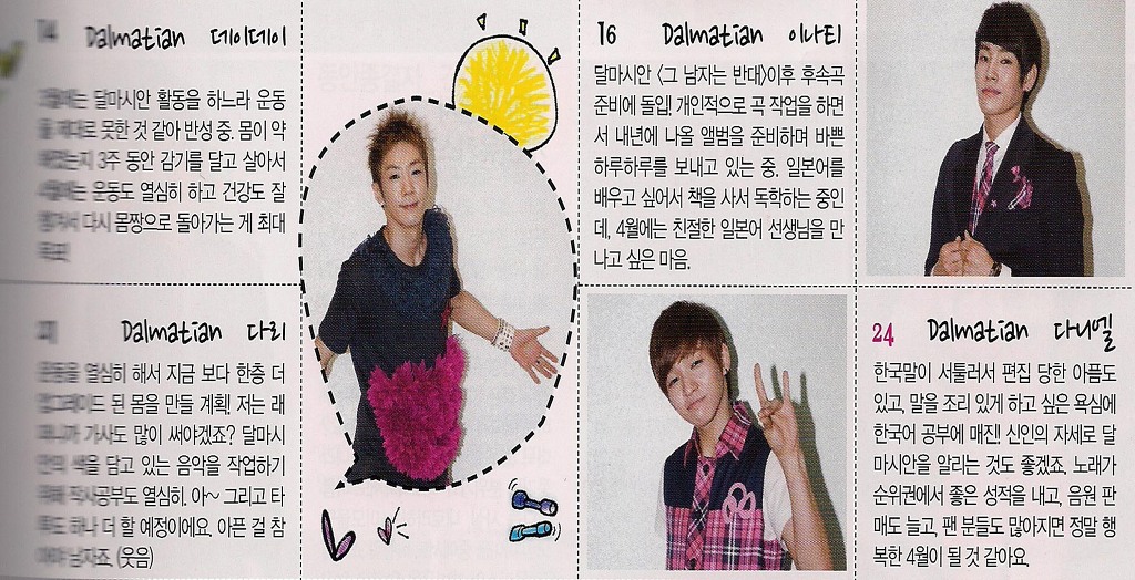 He does get upset when he gets edited out for his insufficiency in Korean, but he is putting his all into studying Korean in wanting to speak Korean that sounds logical! As a rookie, it’s good to let Dalmatian’s name be known, along with our song gaining good results from ranking in the top half of the charts. A lot of albums were sold, the amount of fans grew, and I think this has been a really happy April.
